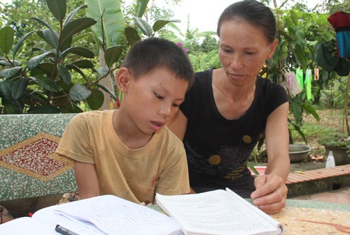 "Đấy anh xem, học đến lớp 5 mà không biết đọc, biết viết. Gia đình tôi rất buồn và thắc mắc tại sao học sinh không biết chữ mà nhà trường vẫn cho lên lớp. Nếu các thầy, cô giáo nghiêm khắc hơn thì cháu không đến nỗi thế này"- Chị Nguyễn Thị Vinh, thôn Nghĩa An, xã Nghĩa Phương (mẹ Vịnh) nói.