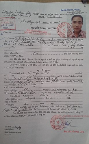Quyết định truy nã của cơ quan công an đối với Tuấn. |
