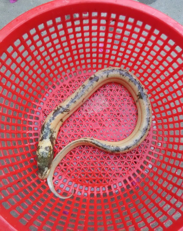 | Bắt được con lươn có hoa văn lạ dài nửa mét ở miền Tây. Ảnh: Báo Dân Trí |