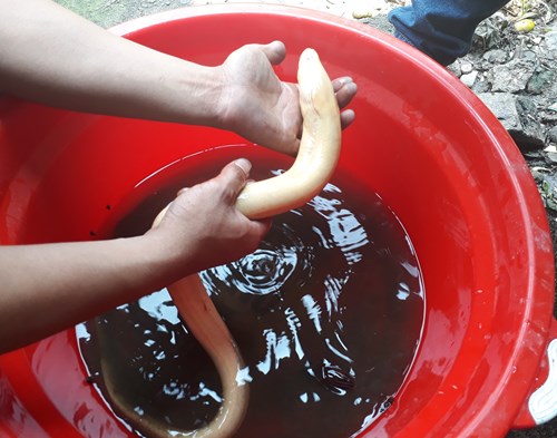 Người dân bắt được lươn "bạch tạng" hiếm gặp tại Hà Tĩnh. Ảnh: Infonet
