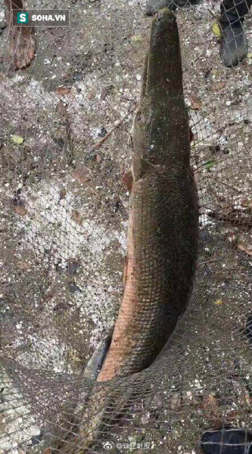Trong lúc đánh bắt, họ vô tình bắt được một "quái ngư" dài hơn 1m, nặng khoảng 10-15kg. Theo Sina, đây thực ra là một cá thể cá láng lớn Bắc Mỹ (một trong những loài cá nước ngọt lớn nhất Bắc Mỹ có tên tiếng Anh là Atractosteus spatula).