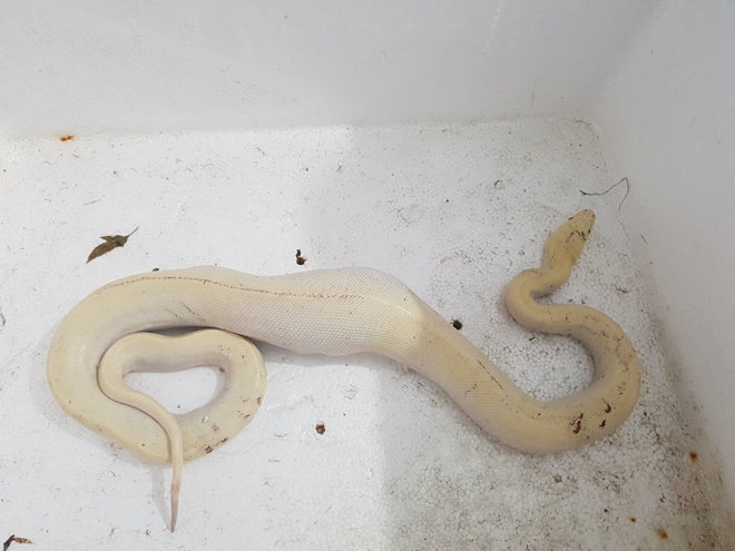 Con trăn này hơn 2kg, dài trên 1m, toàn thân màu trắng, đầu có hoa văn trông rất lạ. Sau khi bắt được con trăn, bà Hai nuôi nhốt trong thùng xốp.