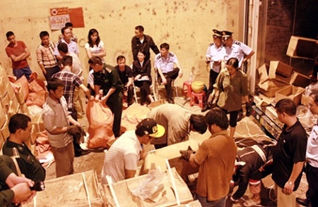 Cơ quan chức năng kiểm tra phát hiện lượng lớn ngà voi và vẩy tê tê - Ảnh: CAND |