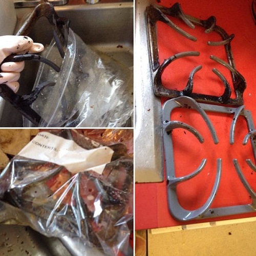 Theo đó, sau khi gỡ dàn bếp ra, bạn cho vào túi nhựa, có kéo khóa đựng khí ammonia rồi để qua đêm. Đến sáng mai các chất bẩn và vết cháy bám vào trong quá trình nấu nướng đã được tẩy hết, bạn chùi rửa rất dễ dàng.