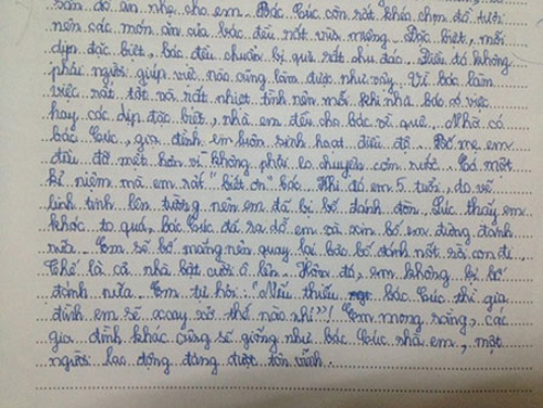 “Hồi bé, em quý bác lắm. Bác ru em ngủ, đèo xe đạp đưa em tới trường, chơi cùng hai anh em. Lúc đó, bác cũng hiền lắm. Nhưng bây giờ càng lớn em càng bị bác mắng nhiều. Bác toàn bảo em 'sao chậm thế', trong khi bố mẹ em cũng chê bác chậm suốt.