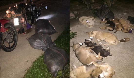 Phát hiện lực lượng công an xã, nhóm "cẩu tặc" liền lên xe phóng ga bỏ chạy. Đi được khoảng 1km thì vứt lại xe máy cùng hơn 1 tạ chó rồi trốn vào rừng keo.