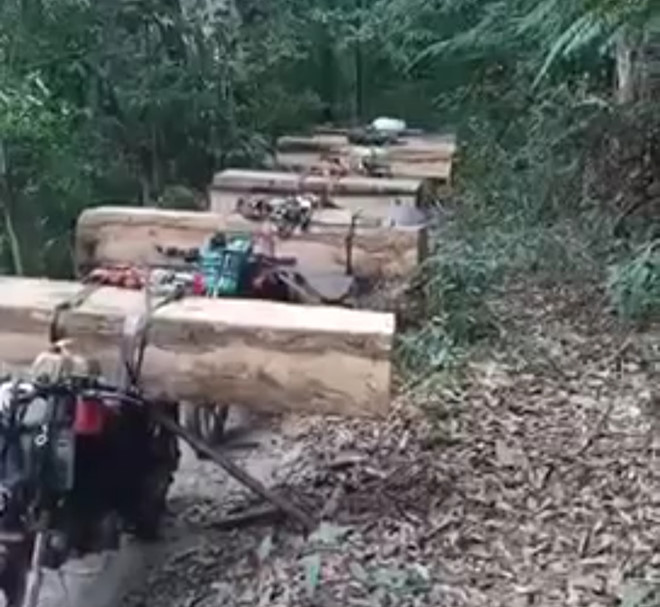 Lực lượng chức năng mật phục, bắt quả tang 11 người vận chuyển gỗ lậu. Ảnh: Thanh niên |