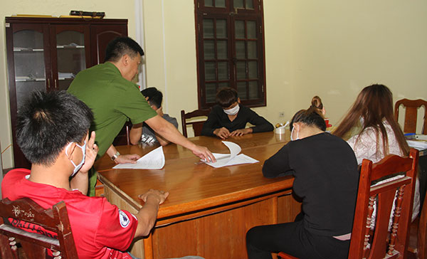 Các đối tượng mua, bán dâm bị đưa về trụ sở công an để làm việc. Ảnh: Công an Nhân dân |