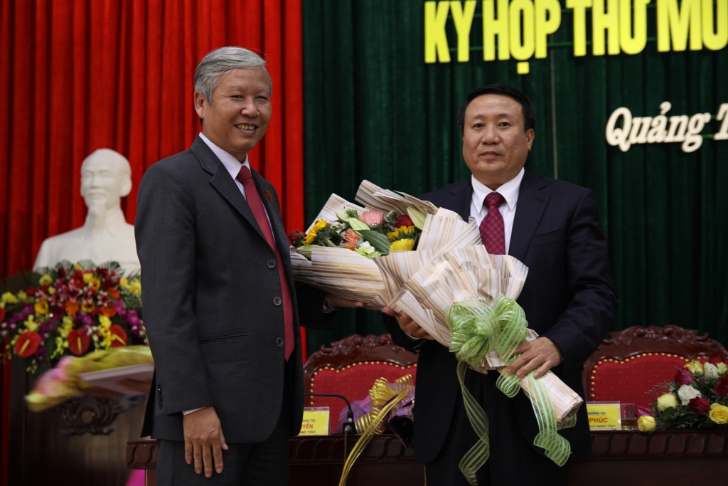 | Ông Hà Sĩ Đồng (người cầm hoa) được lãnh đạo tỉnh tặng hoa chúc mừng nhận chức Phó Chủ tịch UBND tỉnh Quảng Trị |