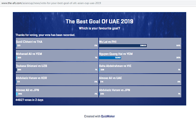 Đặc biệt là bàn thắng của Quang Hải ghi vào lưới Yemen ở trận cuối cùng vòng bảng và bàn thắng của Wul Lei (Trung Quốc) ghi vào lưới Philippines cũng ở vòng bảng mà trước đây sau khi kết thúc vòng bảng AFC đã tiến hành bầu chọn thì Quang Hải đã thắng áp đảo Wu Lei rồi. Nhưng nay bàn thắng của Wu Lei lại đang dẫn áp đảo Quang Hải.