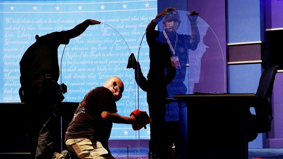 Các nhân viên của Ủy ban Tranh luận Tổng thống lau chùi các tấm kính bảo vệ mới lắp đặt ở vị trí giữa các ghế của các ứng viên. Ảnh: ABC News. |