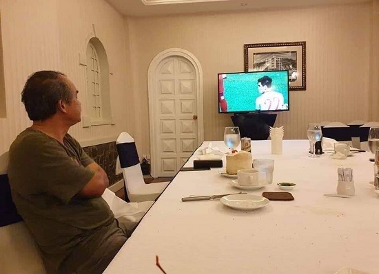 Ông Đoàn Nguyên Đức dõi theo U22 Việt Nam qua màn ảnh nhỏ. |
