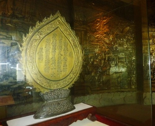Ngoài ra, vua cho xây gần chùa một hành cung để quan quân có chỗ nghỉ ngơi khi đến thăm... Lúc hoàn thành, vua ban dòng chữ “Ngự chế Tam Thai tự, Minh Mạng lục niên phụng tạo” (tạm dịch: Ngự chế chùa Tam Thai, lập năm Minh Mạng thứ sáu), đồng thời cho đúc một kim bài bằng đồng có hình quả tim lửa đang cháy và cũng là hình chiếc lá bồ đề. Đây chính là lý do mọi người vẫn gọi kim bài là quả tim lửa, cao 45cm, rộng 35cm.