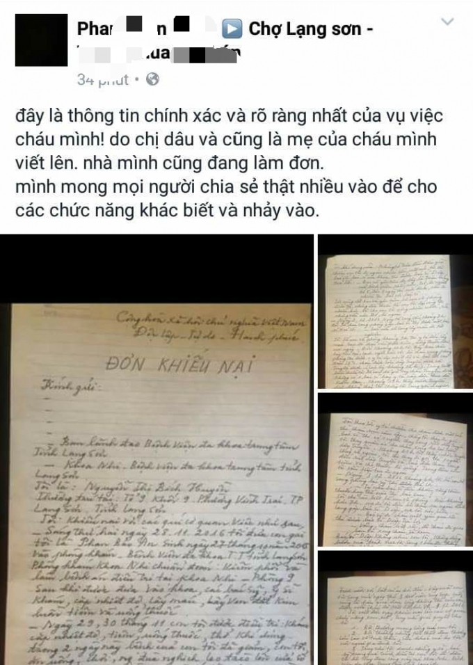 Như trước đó đã đưa tin, trên Facebook P.N.T có chia sẻ một status nhận được sự quan tâm của cộng đồng mạng. Trong đó, người này đề cập đến việc bé Bảo A. (14 tháng tuổi, trú phường Vĩnh Trại, Lạng Sơn) vào điều trị viêm phổi. Sau đó, cháu bé bị tiêu chảy. Tuy nhiên, bé bị tử vong sau 4 ngày điều trị. Người nhà cho rằng, có thể do bác sĩ "tắc trách" trong quá trình điều trị.