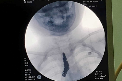 Theo báo Bảo vệ pháp luật, sau khi thăm khám và chụp phim X-quang, các bác sỹ phát hiện hình ảnh cản quang bất thường tương ứng khí quản và một phần phế quản gốc bên phải.
