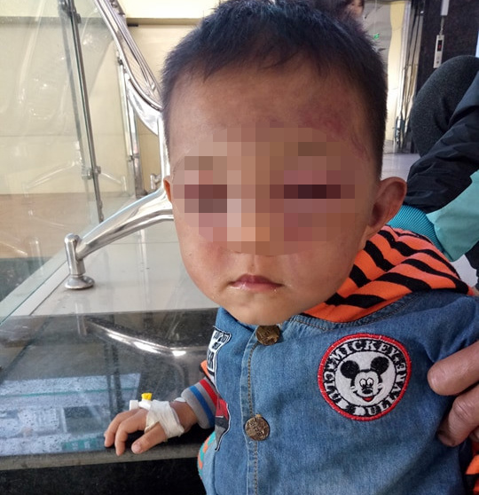 Một bé trai 2 tuổi ở Nghệ An được cho là bị cha dượng đánh sưng húp cả mặt.