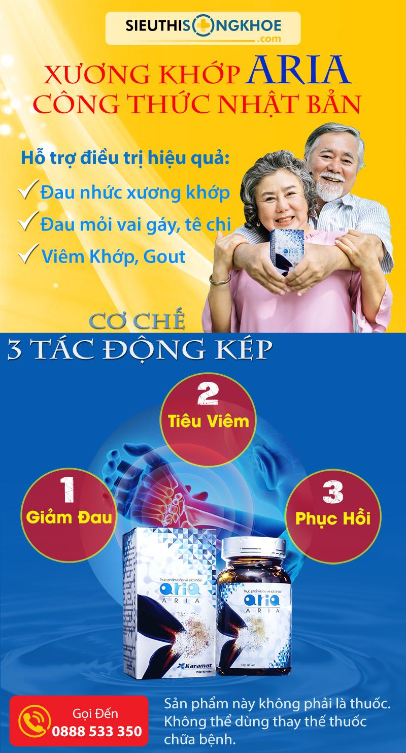 Aria là sản phẩm độc đáo được sản xuất dựa trên công thức Nhật Bản, được đánh giá hiệu quả trong việc hỗ trợ điều trị đau mỏi vai gáy do phong thấp, viêm cơ, dây thần kinh bả vai gây ra. Aria cũng giúp cải thiện tình trạng nhức mỏi xương khớp tổng thể, theo cơ chế giảm đau → tiêu viêm → phục hồi, hoàn toàn lành tính và không gây tác dụng phụ.