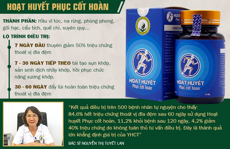 Sản phẩm Hoạt huyết Phục cốt hoàn do Trung tâm Nghiên cứu và Ứng dụng Thuốc dân tộc bào chế là sản phẩm tích hợp được những yếu tố trị bệnh kể trên. Cụ thể: - Sử dụng Hoạt huyết Phục cốt hoàn giúp người bệnh thoát khỏi các triệu chứng thoát vị đĩa đệm trong thời gian dài, ngăn ngừa tái phát nếu điều trị dự phòng thường xuyên.