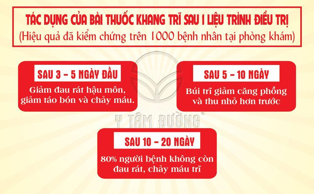 Với 3 tác dụng trên sẽ giúp bệnh nhân đi tiêu nhẹ nhàng, không đau rát, không chảy máu, búi trĩ thu gọn, hậu môn khô ráo không còn tiết dịch và ngứa ngáy.