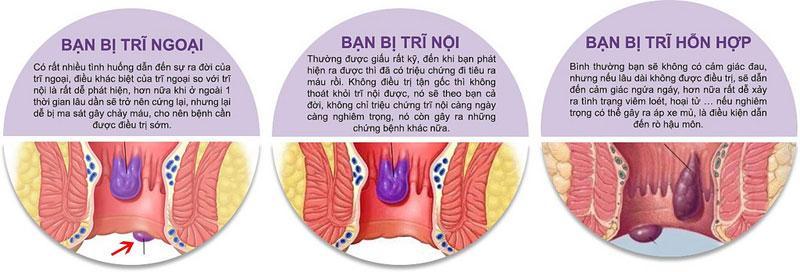 Bệnh trĩ được phân ra thành 3 dạng phổ biến tùy theo vị trí của chúng:
