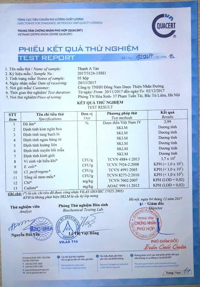 Sản phẩm Thanh A Tán được sản xuất dựa trên công thức gia truyền gần 60 năm. Quy trình chiết xuất Thanh A Tán đạt tiêu chuẩn và đã được Cục an toàn thực phẩm chứng nhận tốt cho sức khỏe.