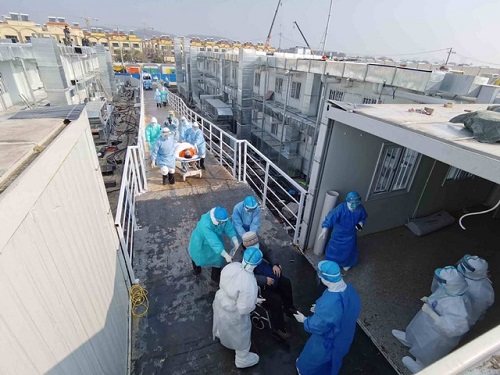 Các nhân viên y tế trong trang phục bảo hộ bắt đầu vận chuyển bệnh nhân tới bệnh viện dã chiến Hỏa Thần Sơn vào sáng nay (4/2) giờ địa phương. Ảnh: Chinadaily |