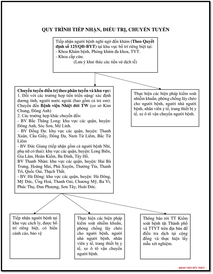 Theo quyết định số 125/QĐ-BYT, các cơ sở y tế tiếp nhận người bệnh nghi ngờ đến khám ở khu vực được bố trí riêng biệt: Khoa Khám bệnh, Phòng khám Đa khoa, Trạm y tế; Khoa Cấp cứu (bác sĩ cần khai thác thêm tiền sử dịch tễ của bệnh nhân).