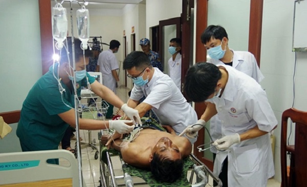 Bệnh xá đảo An Bang đã tiếp nhận và cấp cứu ngư dân Huỳnh Tấn Vinh, làm nghề câu mực trên tàu Quảng Ngãi 95821 TS, bị thương vùng bụng kín do va vào thành tàu khi xảy ra tai nạn lao động.