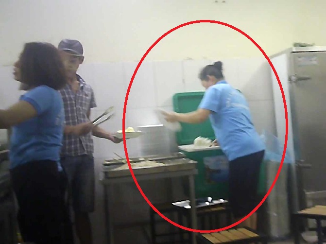 Nhân viên bếp ăn dùng tay bốc thực ăn trần |