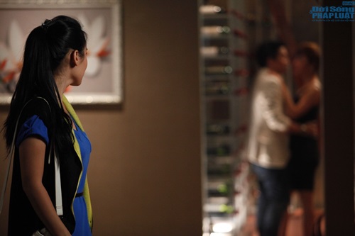 Mộc Miên (Tú Vi) vô tình chứng kiến nụ hôn nóng bỏng của Bảo Ngọc (Trà My Idol) và Bếp trưởng Hoàng Quân (Lam Trường). |