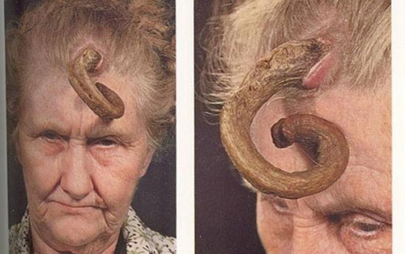 | Người phụ nữ 69 tuổi này đã phải chung sống với chiếc sừng 20cm mọc ra từ trên trán. Năm 2008, bà đã đến gặp bác sĩ và cho biết trước đó mình bị một khối u nhỏ trên trán, sau đó nó phát triển thành chiếc sừng cong như bây giờ. Chiếc sừng của bà đã được phẫu thuật cắt bỏ. |