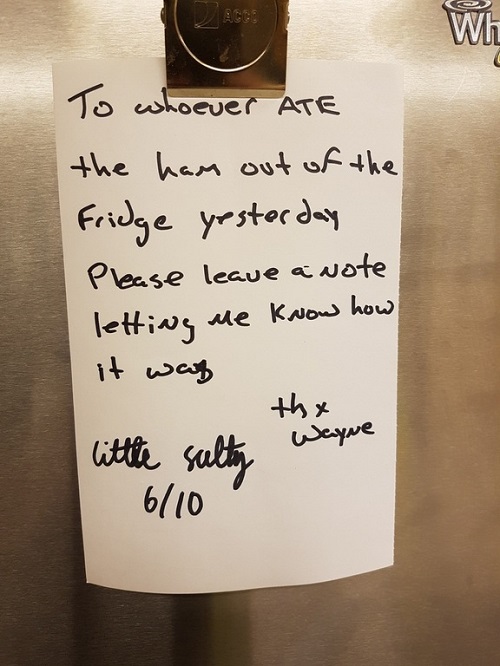 Wayne viết một tin nhắn dán lên gói thịt nguội trong tủ lạnh với nội dung như sau: