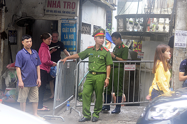 An ninh thắt chặt tại đường vào khu dãy trọ nhà ông Hiệp "khùng" bị cháy. Ảnh: Xuân Đoàn. |