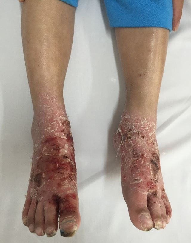 | Bàn chân chằng chịt thương tổn do căn bệnh chàm cơ địa nặng |