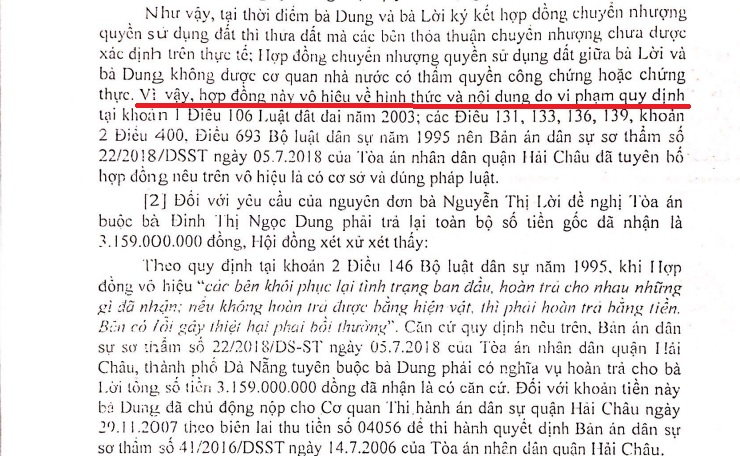 Bản án số 41/2006/DSST ngày 14/7/2006 của TAND quận Hải Châu thể hiện, tại thời điểm bà Dung và bà Lời ký hợp đồng chuyển nhượng quyền sử dụng đất thì thửa đất này chưa được xác định trên thực tế; hợp đồng không được cơ quan Nhà nước có thẩm quyền công chứng hoặc chứng thực. TAND quận Hải Châu tuyên bố hợp đồng chuyển nhượng quyền sử dụng đất giữa 2 người dân này vô hiệu, buộc bà Dung phải trả cho bà Lời 3,1 tỷ đồng và số tiền bồi thường thiệt hại là 527 triệu đồng. Tổng cộng hơn 3,6 tỷ đồng.