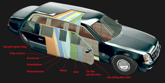 Lớp vỏ ngoài cùng của xe có độ dày khoảng 6 inch (hơn 15 cm), được cấu thành từ khoảng 8 lớp vật liệu chính, bao gồm lớp phủ ngoài, lớp thép và titan, lớp chống đạn armormax, polyethylene, polycarbonate, nhôm, gốm và một tổ hợp các lớp vật liệu khác. Ngoài ra, bên trong đó còn được bọc thêm một lớp chống đạn mềm. Giữa các lớp có một vùng chân không.