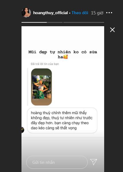 Trước những bàn tán xôn xao cho rằng Hoàng Thùy sửa mũi, người đẹp đã nhanh chóng lên tiếng phủ nhận: “Mũi đẹp tự nhiên không có sửa ha”.