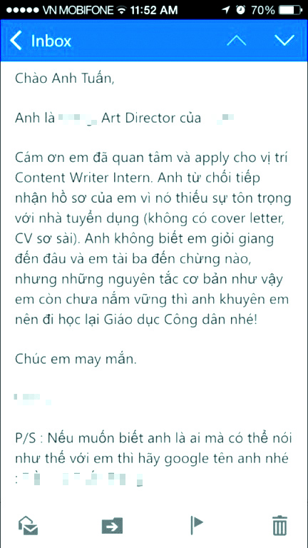 Cụ thể, nội dung của bức thư có nêu lý do anh Đăng từ chối tiếp nhận hồ sơ xin việc của ứng viên Anh Tuấn vì “Thiếu tôn trọng nhà tuyển dụng”, không có cover letter (thư xin việc-PV) và CV sơ sài.