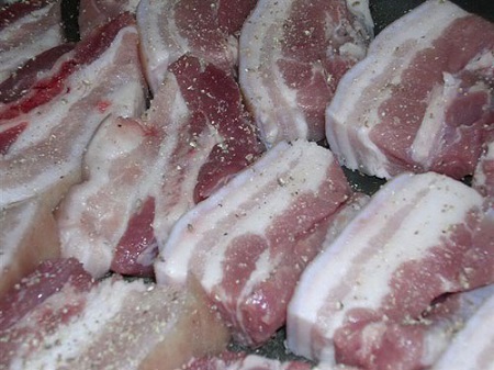 Để gói bánh chưng ngon, không thể thiếu thịt và hành khô. Hành khô bóc sạch vỏ, thái nhỏ. Hạt tiêu tự xay hoặc mua tại chợ. Nhân bánh là thịt lợn có cả nạc và mỡ (thường là thịt ba chỉ). Mỡ thịt để cho bánh béo ngậy. Thịt thái miếng to đều, ướp gia vị vừa đủ, rắc ít hạt tiêu để thêm hương nồng nàn và đặc biệt sau khi bánh chín sẽ có mùi thơm và vị cay nhẹ. Một điều chú ý là bạn không nên cho mắm để ướp thịt gói bánh chưng, bởi cho mắm vào thịt sẽ khiến bánh chưng gói xong không để được lâu.