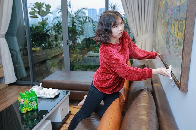 Chị Hoài cũng chia sẻ thêm một số “mẹo” dọn nhà khá hay mà chị đọc được trên mạng như nên quét dọn theo thứ tự từ trên xuống dưới và từ trong ra ngoài, theo kiểu như cách làm 5S của Nhật. Tức là, bắt đầu dọn từ tầng thượng đi xuống và từ bếp ra ngoài sân. Lau sạch sẽ bụi bẩn bám trên các đồ vật bằng gỗ, kim loại như gương, kính. Tiếp theo, bạn mới quét dọn mạng nhện, bụi bặm ở góc nhà.