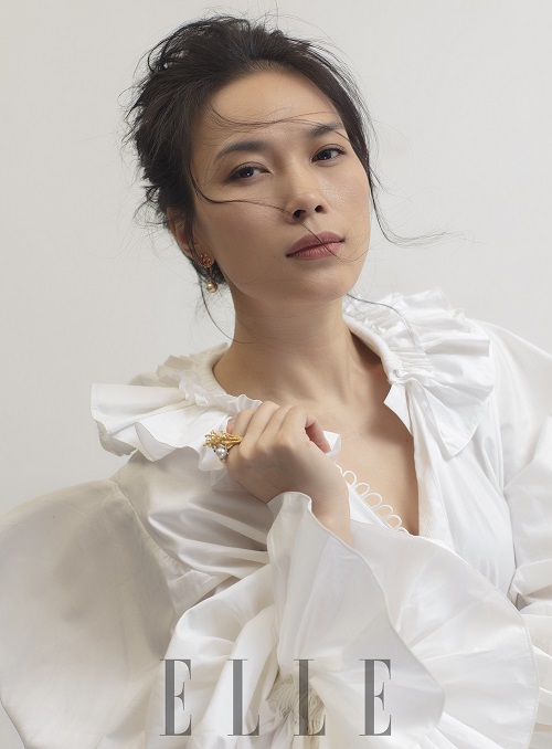 Kiểu tóc búi cao với vài sợi tóc thề xoăn nhẹ phù phép giúp diện mạo của Ngô Thanh Vân như trẻ ra vài tuổi. |