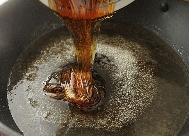 - Khuấy liên tục trên lửa nhỏ cho đến khi si rô đường mạch nha xuất hiện bọt lớn.