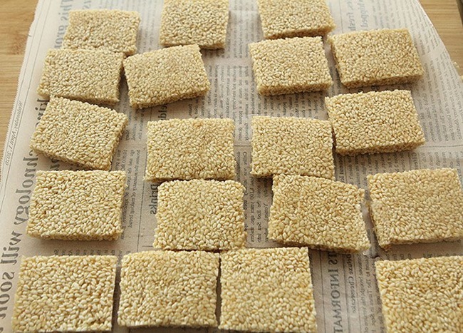 - Trong khi kẹo còn hơi nóng, bạn hãy cắt thành những miếng vừa ăn, để nguội rất khó cắt. Khi mè xửng nguội hoàn toàn, dùng màng bọc thực phẩm bọc lại rồi để vào hộp kín dùng dần.