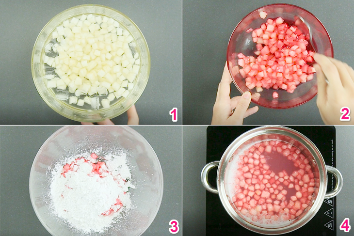 Bước 2: Thứ hai, bạn trộn vào cùng lê 100 gram bột năng, sau đó luộc tới khi hạt lựu nổi lên, vớt ra tô nước đá.