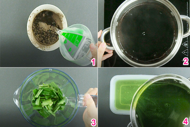 Bước 4: Lúc này, bạn đem xay một ít lá dứa với khoảng 200ml nước lọc, rồi lọc qua rây lấy phần nước lá.