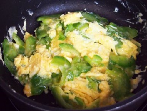 Trứng đập ra bát đánh tan lòng đỏ. Lúc mướp gần được thì đổ trứng vào xào cùng.