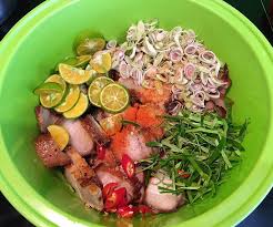 Bước 3: Cho thịt đã cắt vào 1 cái tô lớn, sau đó nêm vào khoảng 2 muỗng canh nước mắm, 1 muỗng canh đường, 1 muỗng canh muối tôm (lưu ý các bạn có thể nêm nếm lại cho vừa khẩu vị nhé). Tiếp tục trộn đều cho thịt thấm gia vị.