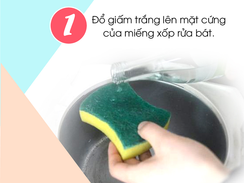+ Chuẩn bị một ít dấm trắng, tiếp đó đổ giấm trắng vào bề mặt bọt biển mềm rửa bát.