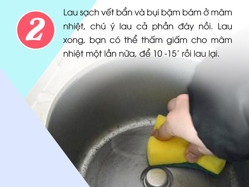 Tiếp đó, bạn lại dùng khăn ướt để lau sạch vết bẩn, đồng thời hút phần giấm còn xót lại trên bề mặt đế nồi cơm điện.