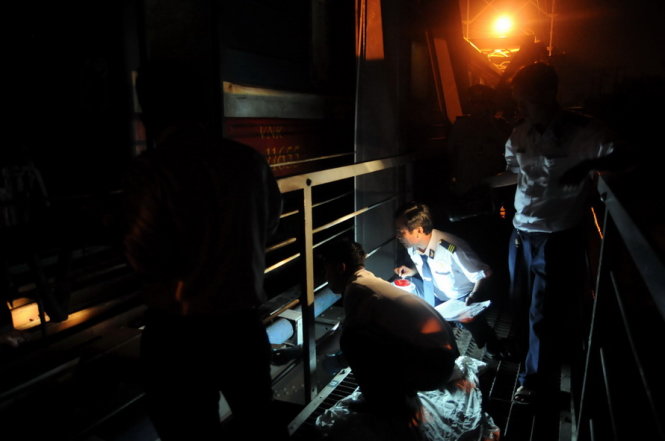 Nhân viên đường sắt cùng lực lượng chức năng xử lý xác nạn nhân sau khi bị tàu đâm. (Ảnh: Tuổi Trẻ) |